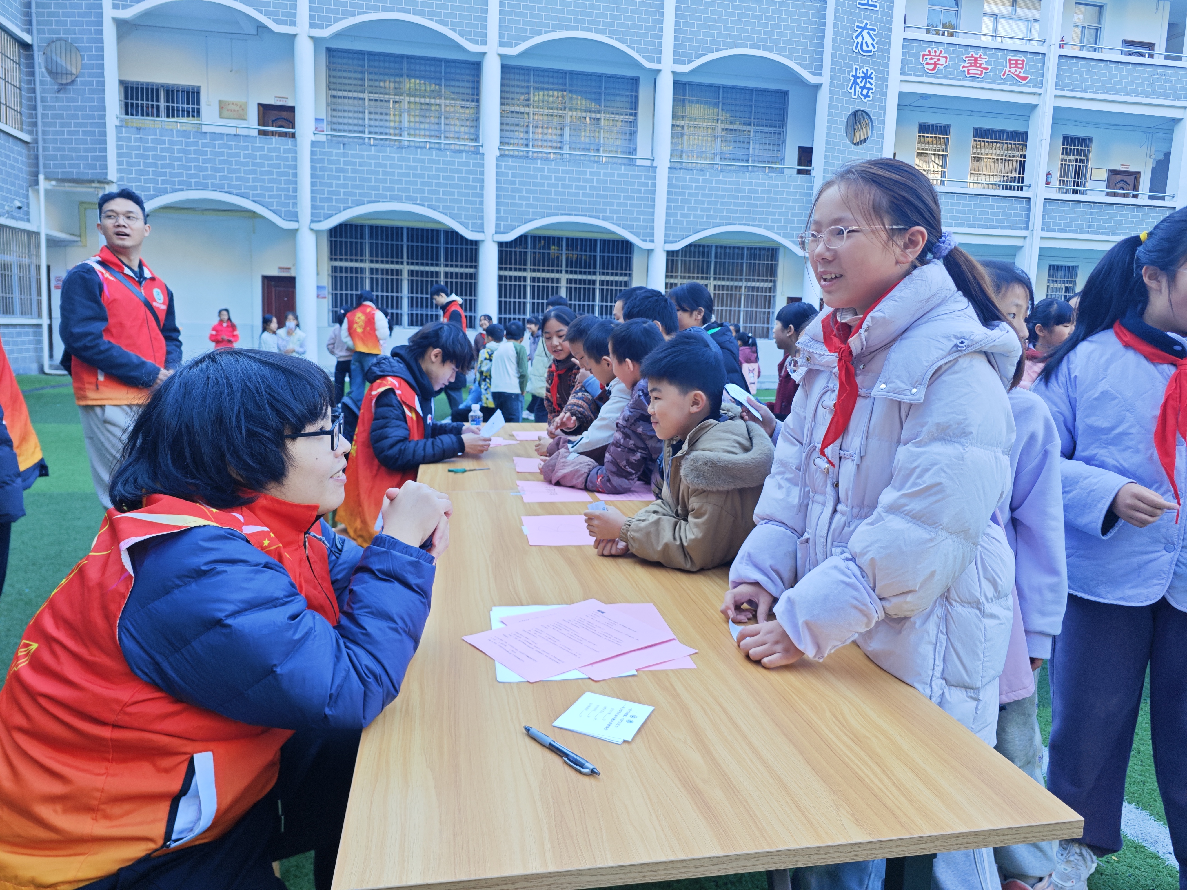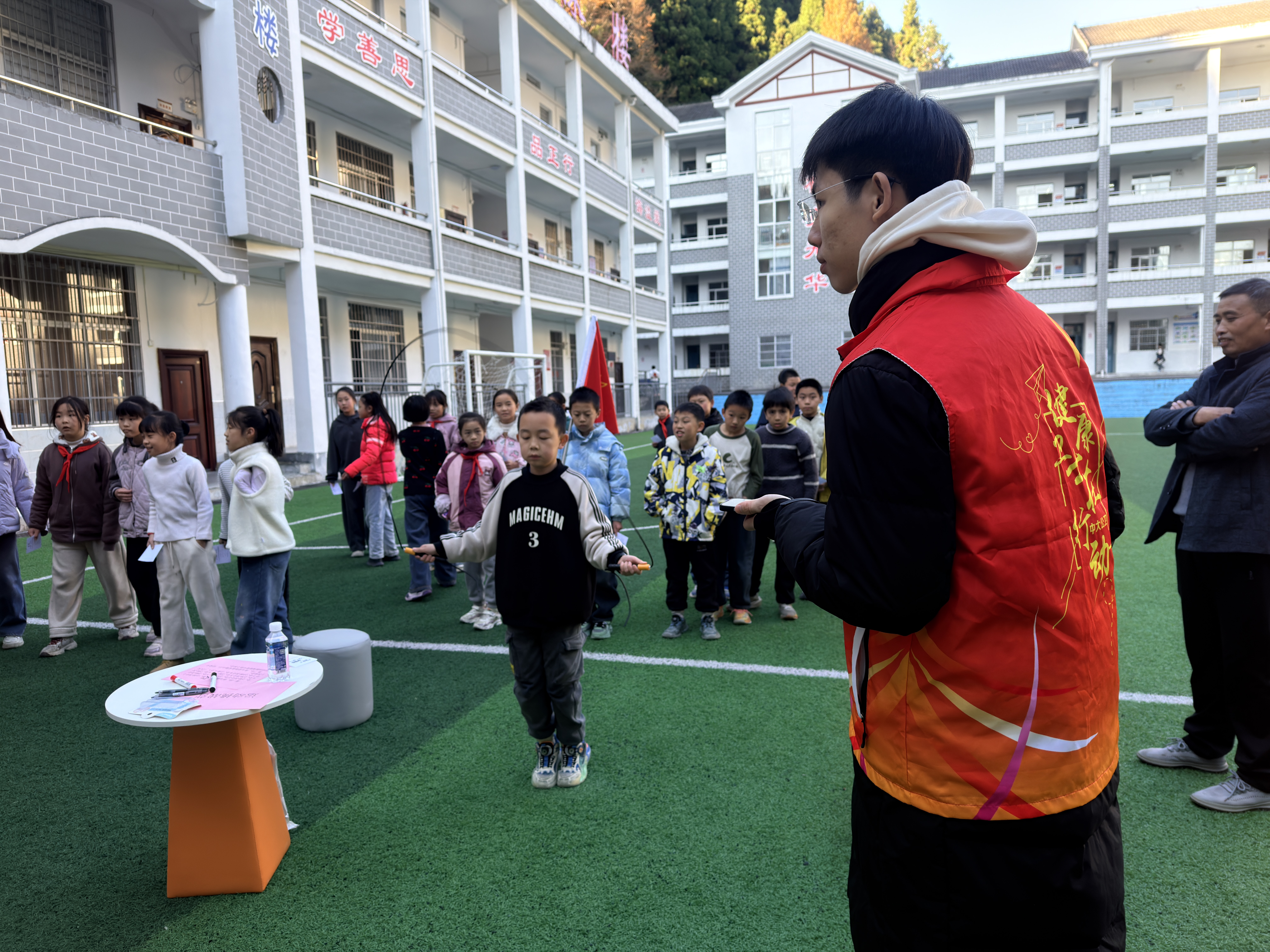 11月21日下午,抵达井冈山后的第一站,队伍成员们便马不停蹄地前往井冈山红军学校,为该校五年级的130余名同学带来了一场别开生面的“‘吃’出健康,‘动’出活力——中小学生吃动平衡科普游园会”。