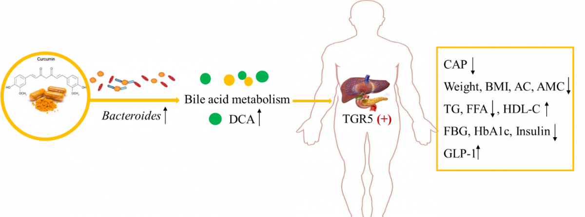 研究成果不仅揭示了姜黄素干预可以有效地降低NASFL患者肝脏脂肪含量、体重、体质指数和血糖水平,还发现姜黄素对NASFL改善作用与其调节肠道菌群介导的胆汁酸代谢和促进胆汁酸受体TGR5激活有关。本研究将为植物化学物姜黄素防治NASFL的临床应用奠定基础。