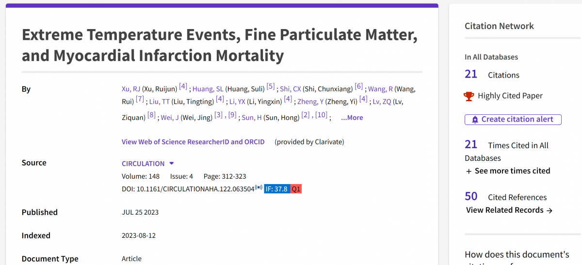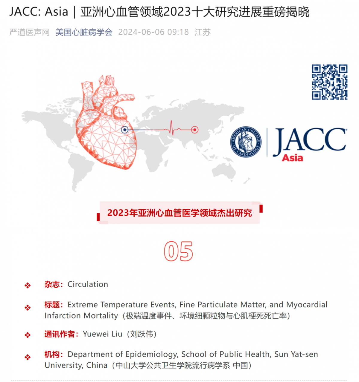 刘跃伟课题组于2023年7月在心血管领域顶级期刊Circulation(IF = 35.5,JCR Q1,中科院一区TOP)发表的题为“Extreme Temperature Events, Fine Particulate Matter, and Myocardial Infarction Mortality”的文章入选2023年亚洲心血管医学领域杰出研究。91吃瓜