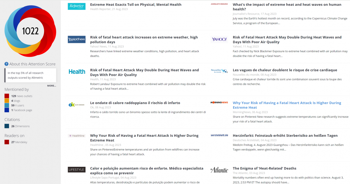 Circulation同期刊发述评文章指出极端高温和大气污染是心血管健康的双重威胁。该论文发表后引起全球广泛关注,吸引了包括CNN News、Yahoo! News和U.S. News在内的129家媒体相继报道。截至2024年6月13日,该论文Attention Score已达1022。