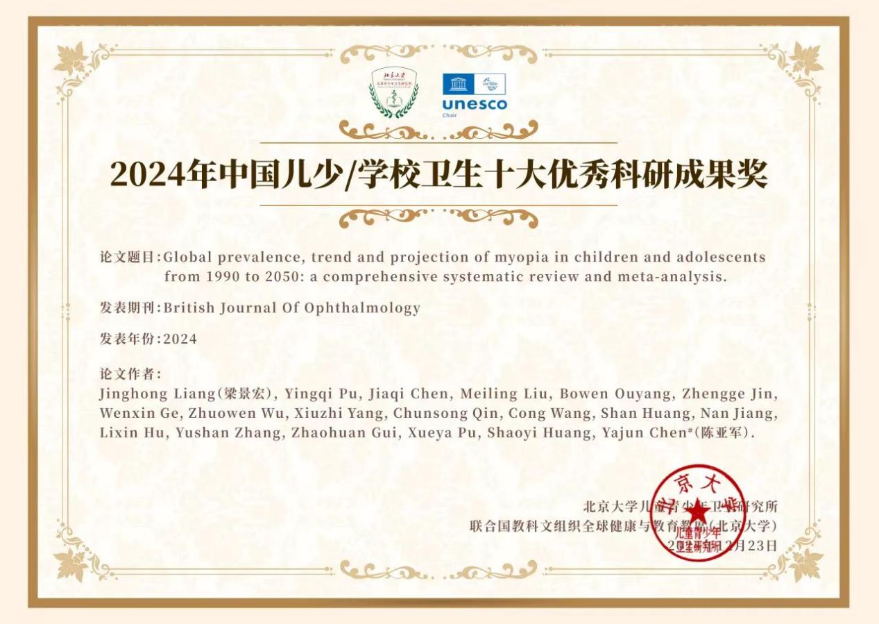 陈亚军教授团队发表在眼科领域权威期刊《英国眼科学杂志》的“Global Prevalence, Trend and Projection of Myopia in Children and Adolescents from 1990 to 2050: A Comprehensive Systematic Review and Meta-analysis” 最终入选2024年中国儿少卫生/学校卫生领域十大优秀科研成果。该研究采用系统评价和meta分析方法,综合了1990年至2023年间,全球50多个国家、276项研究、540多万名儿童青少年的数据,并通过时间序列模型预测了未来30年儿童青少年近视患病率的走势。研究揭示全球大约每三名儿童青少年中就有一人患有近视,预计到2050年,这一年龄段的近视患病人数将超过7.4亿例。研究结果不仅揭示了近视患病率的地域和性别差异,还为制定针对性的视力健康政策提供了科学依据,具有重要的公共卫生和社会影响力。研究发表后,英国BBC,美国CNN,FOX, 法国Reuter,JAMA学术通讯、新华网,参考消息,环球时报等全球150多家媒体做了转载、评述。9月27日,英国医学杂志(BMJ)专门在"Seven days in medicine"对全球近视严峻形势和该研究的意义发表评论。(原文链接://bjo.bmj.com/content/early/2024/08/14/bjo-2024-325427.long)